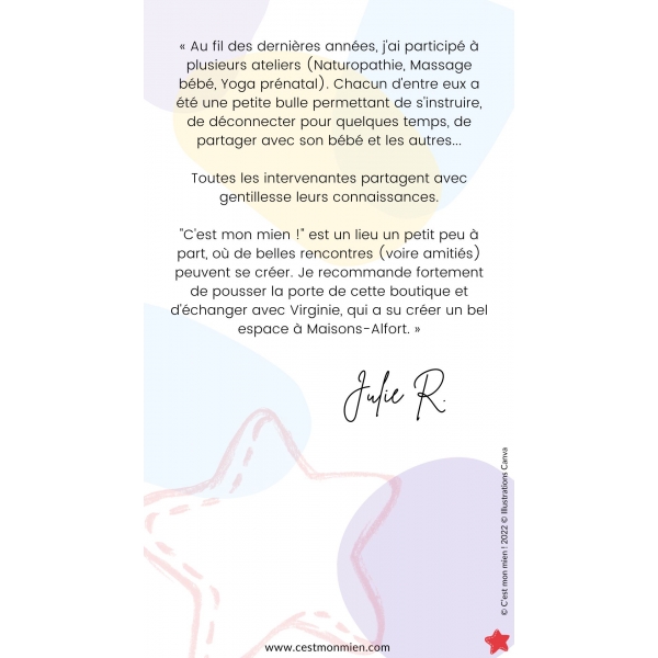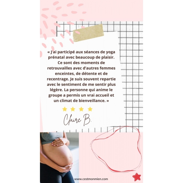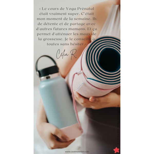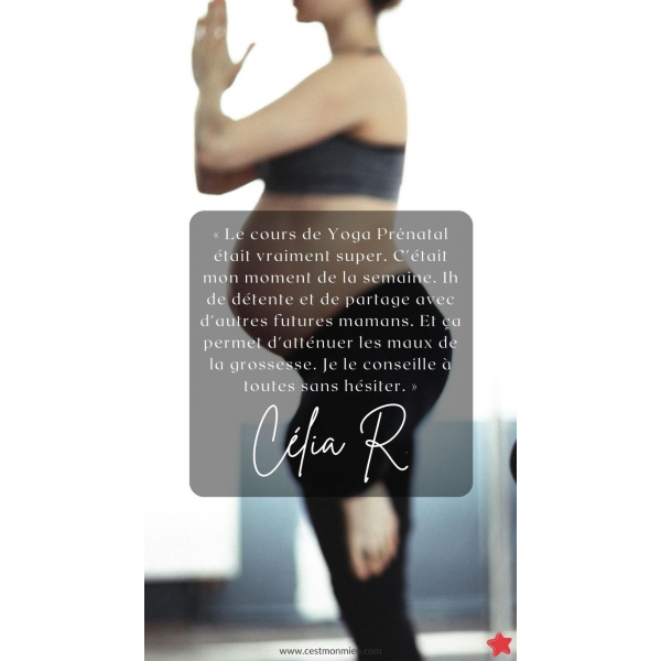 « Le cours de yoga prénatal était vraiment super. C'était mon moment de la semaine. 1h de détente et de partage avec d'autres futures mamans. Et ça permet d'atténuer les maux de la grossesse. Je le conseille à toutes sans hésiter. » Célia R.