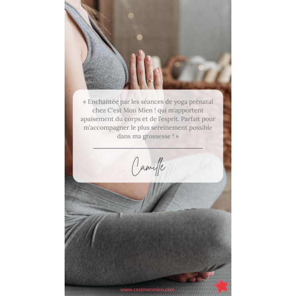 « Enchantée par les séances de yoga prénatal qui m’apportent apaisement du corps et de l’esprit. Parfait pour m’accompagner le plus sereinement possible dans ma grossesse ! » Camille D.