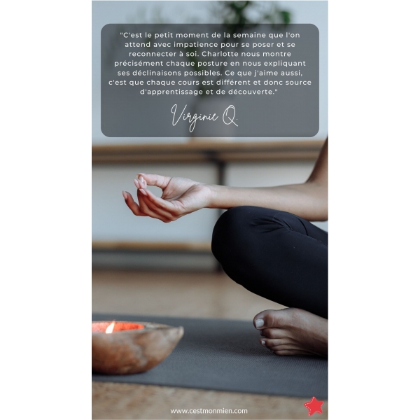 "Cette séance de yoga, c’est ma parenthèse, ma bulle de la semaine. J’en ressors déverrouillée, oxygénée et reconnectée. Le format du petit groupe permet à l'intervenante d’être soucieuse de chacune des participantes. Ses explications sur les bienfaits des postures pratiquées sont de vrais plus dans cet atelier." Nolwenn C.