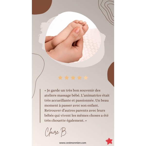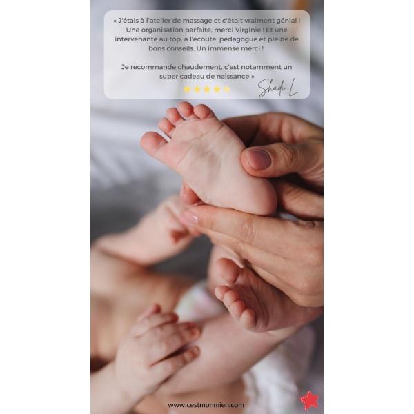 - Tarif : 65 € le cycle de 2 séances de massage bébé (+40 € si 2 parents participants)